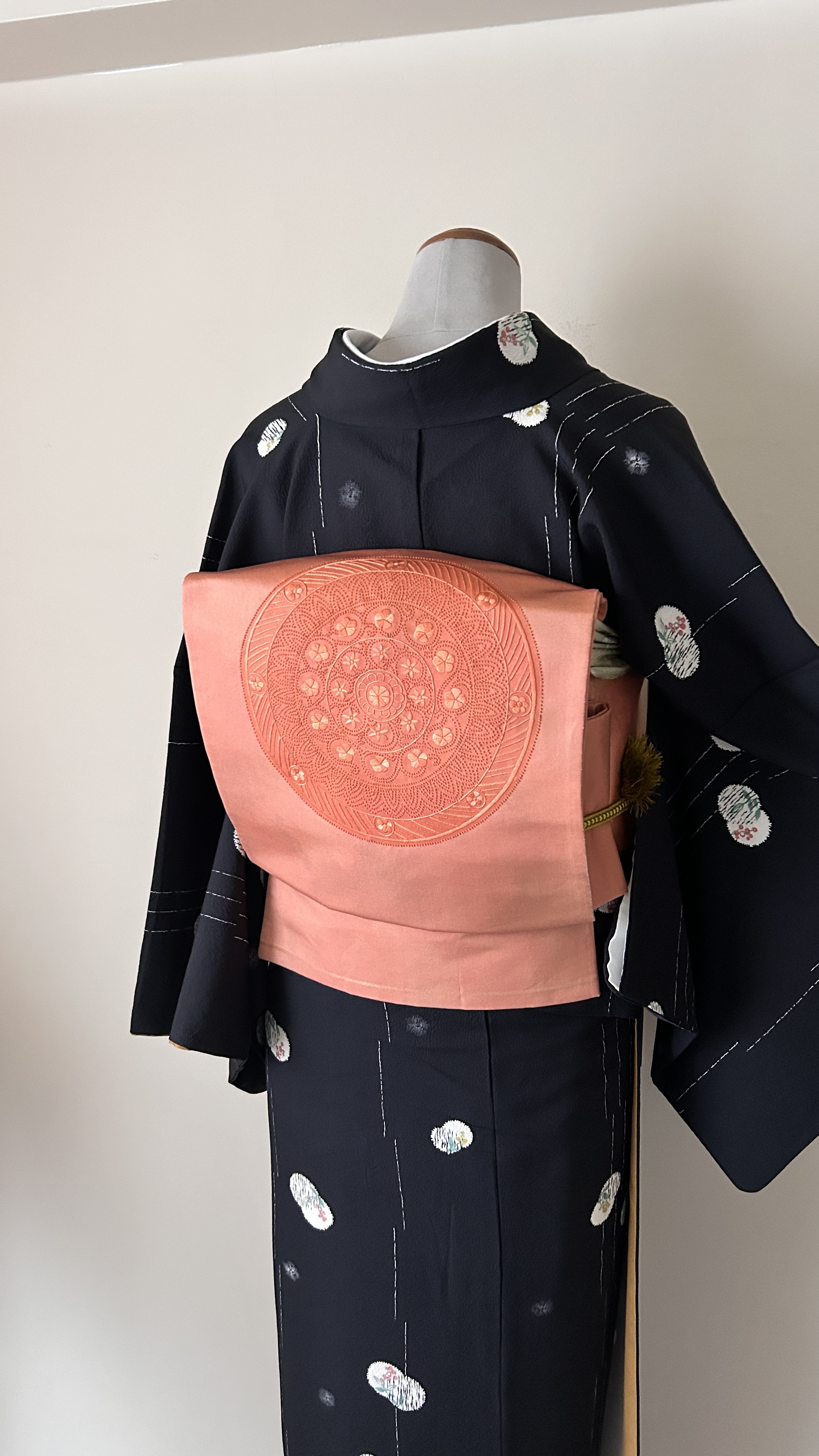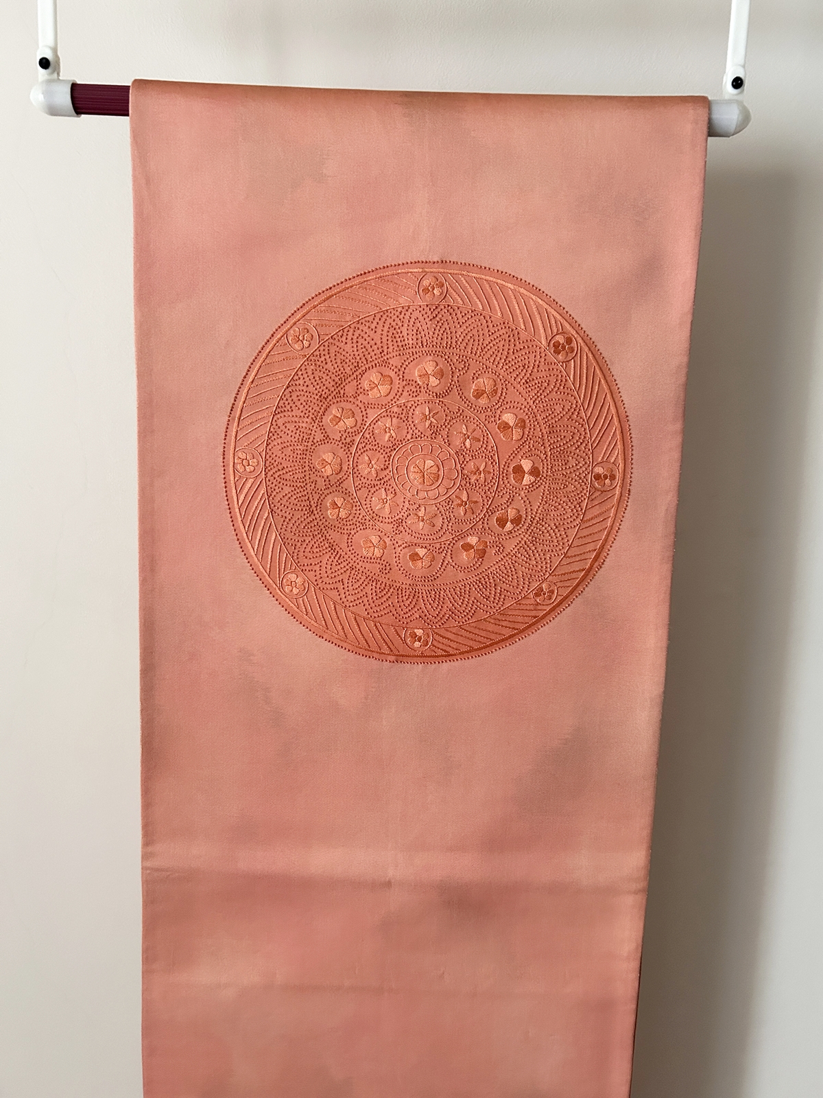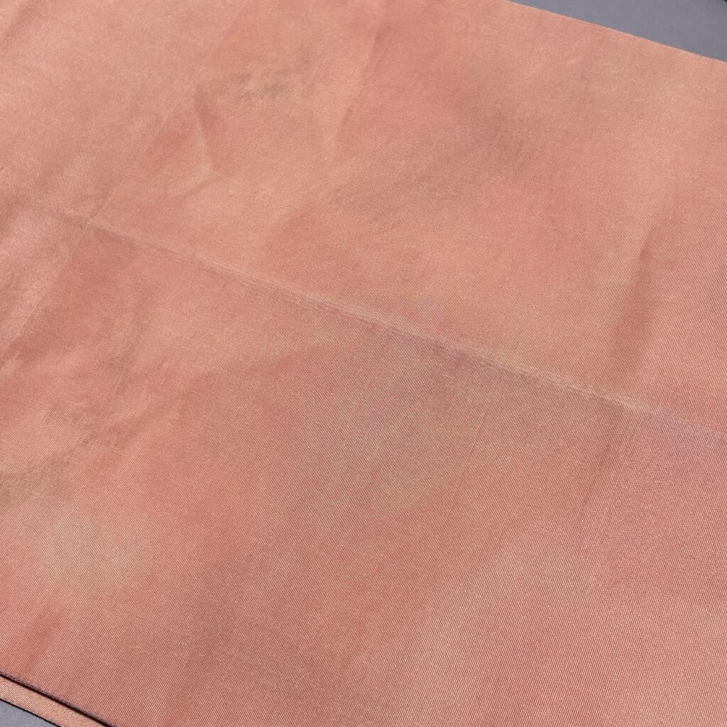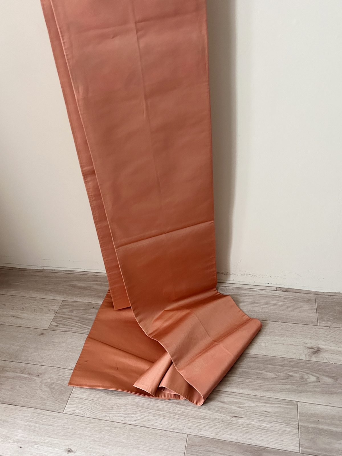 コーラルピンクのマーブル調のぼかし柄の地で、薄くしなやかで扱いやすい帯と思います。