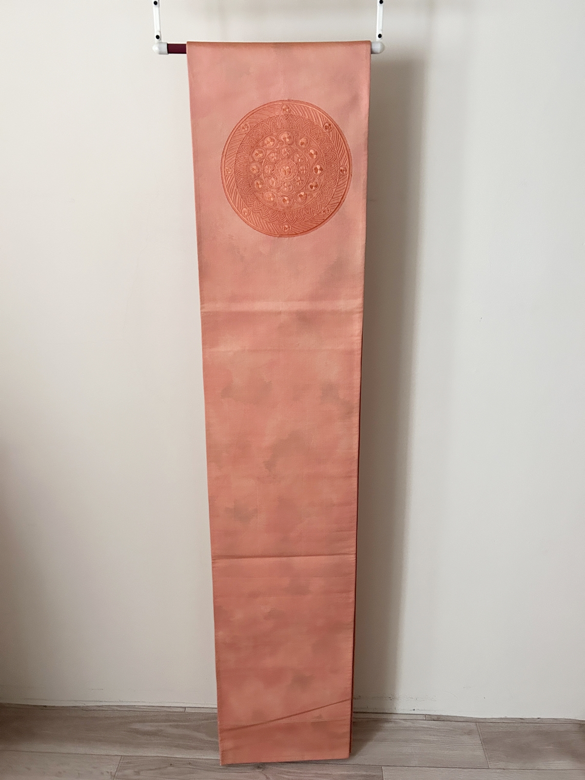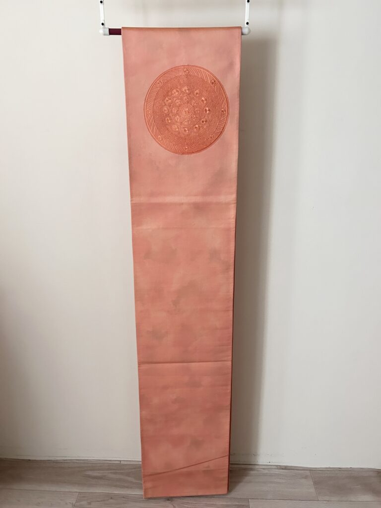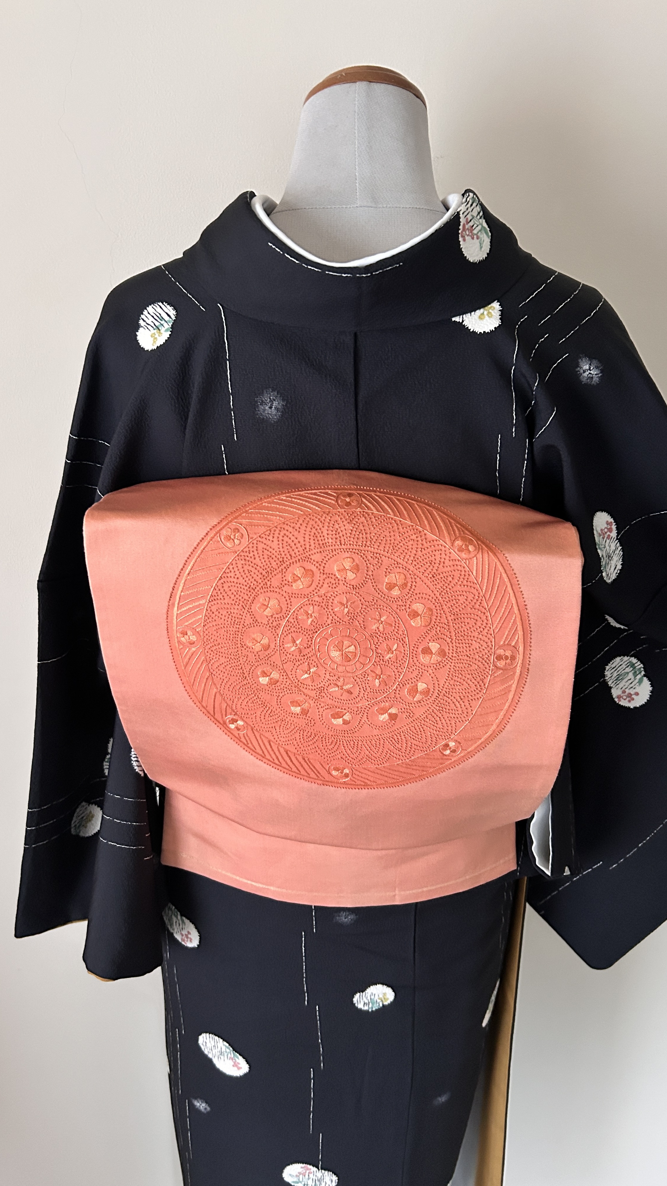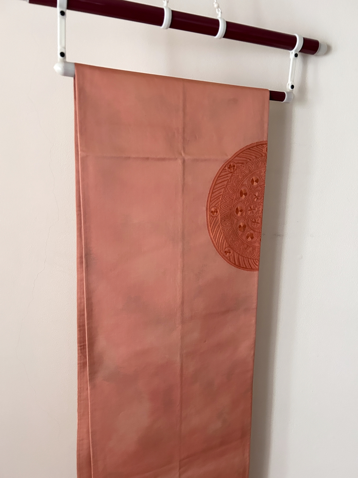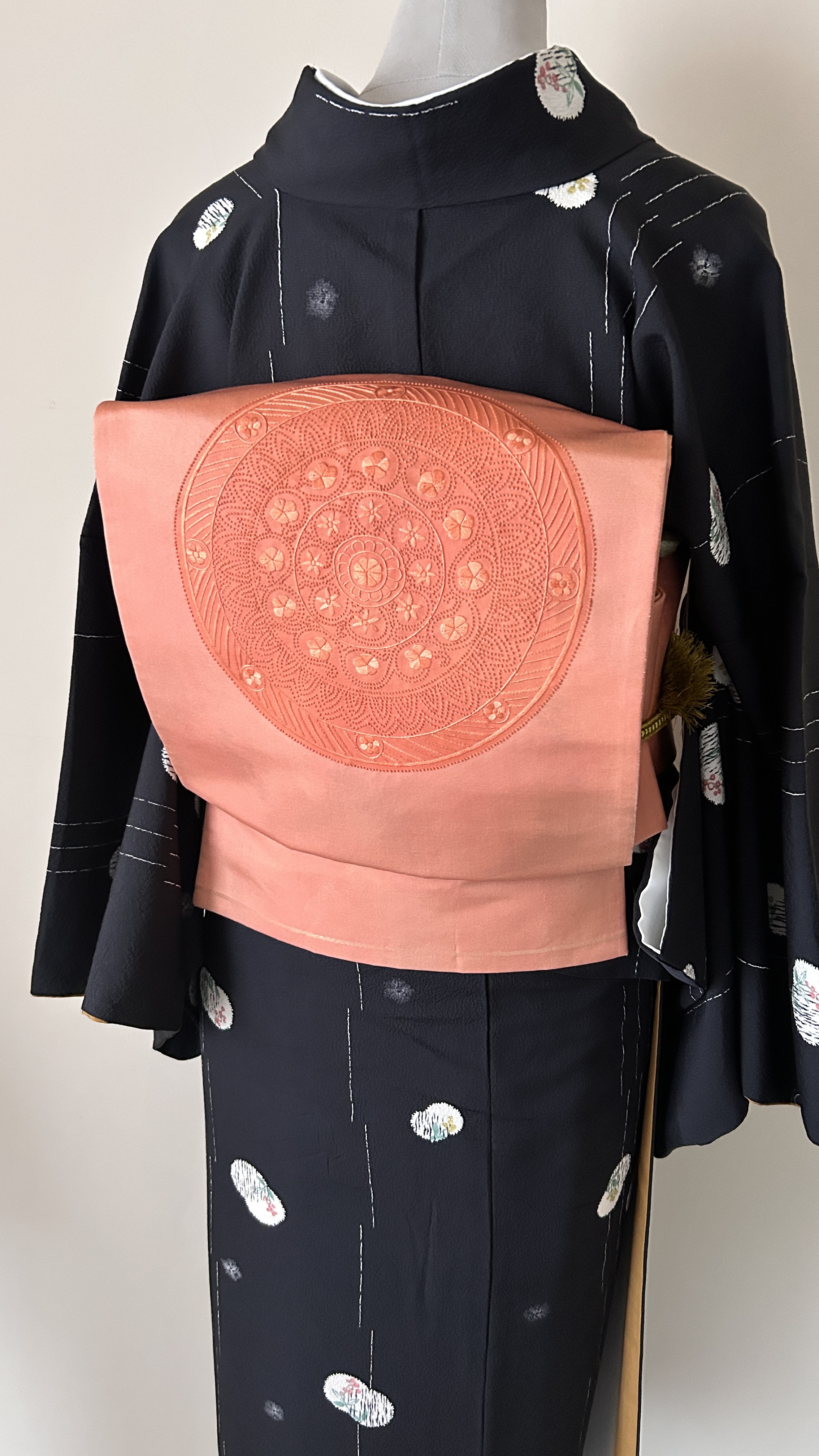 コーラルピンクのマーブル調のぼかし柄の地で、薄くしなやかで扱いやすい帯と思います。