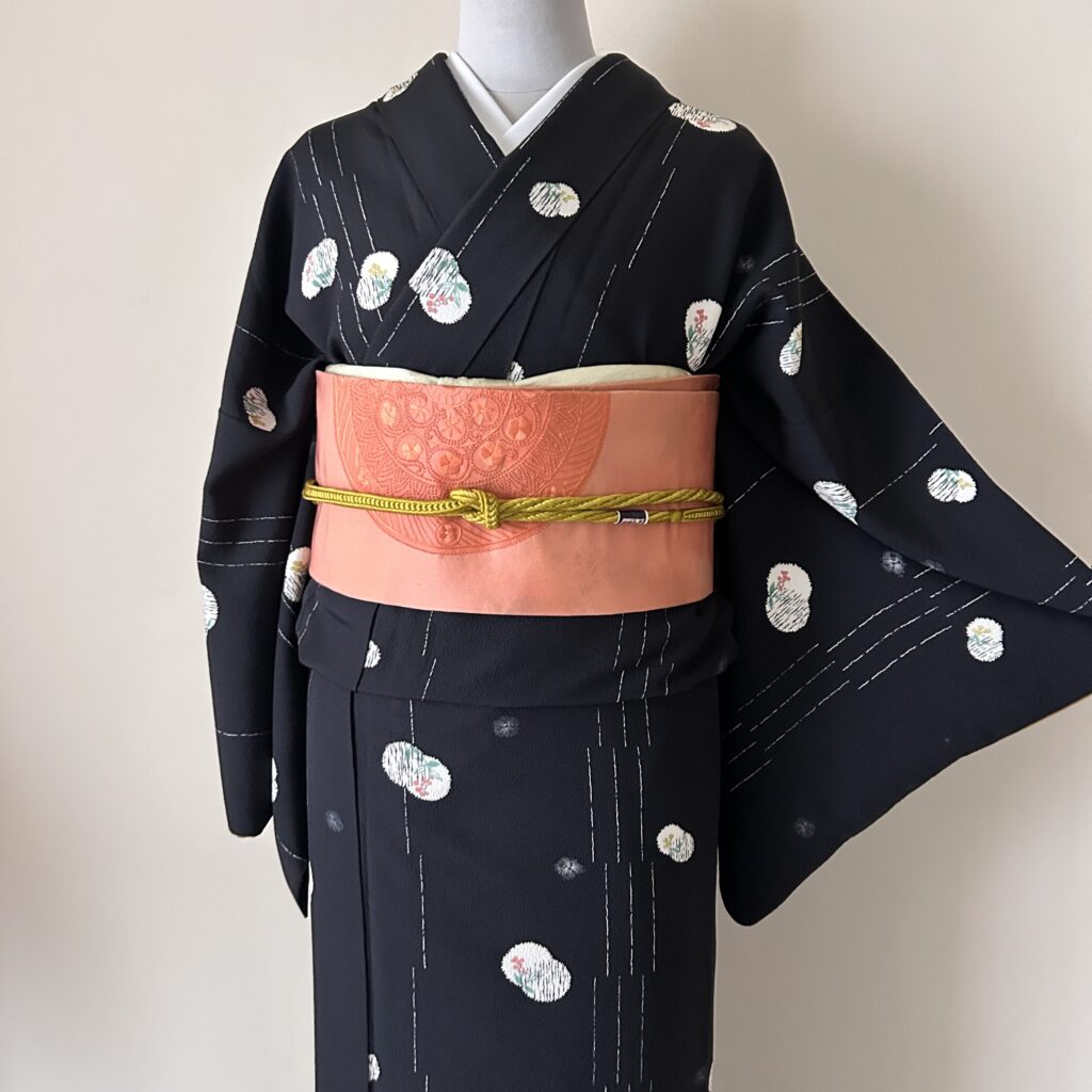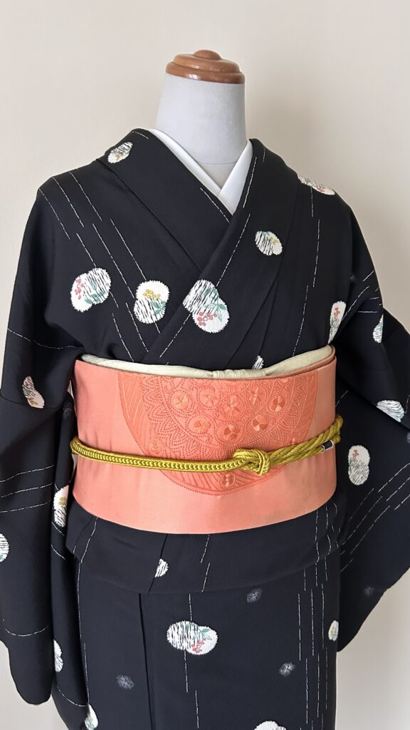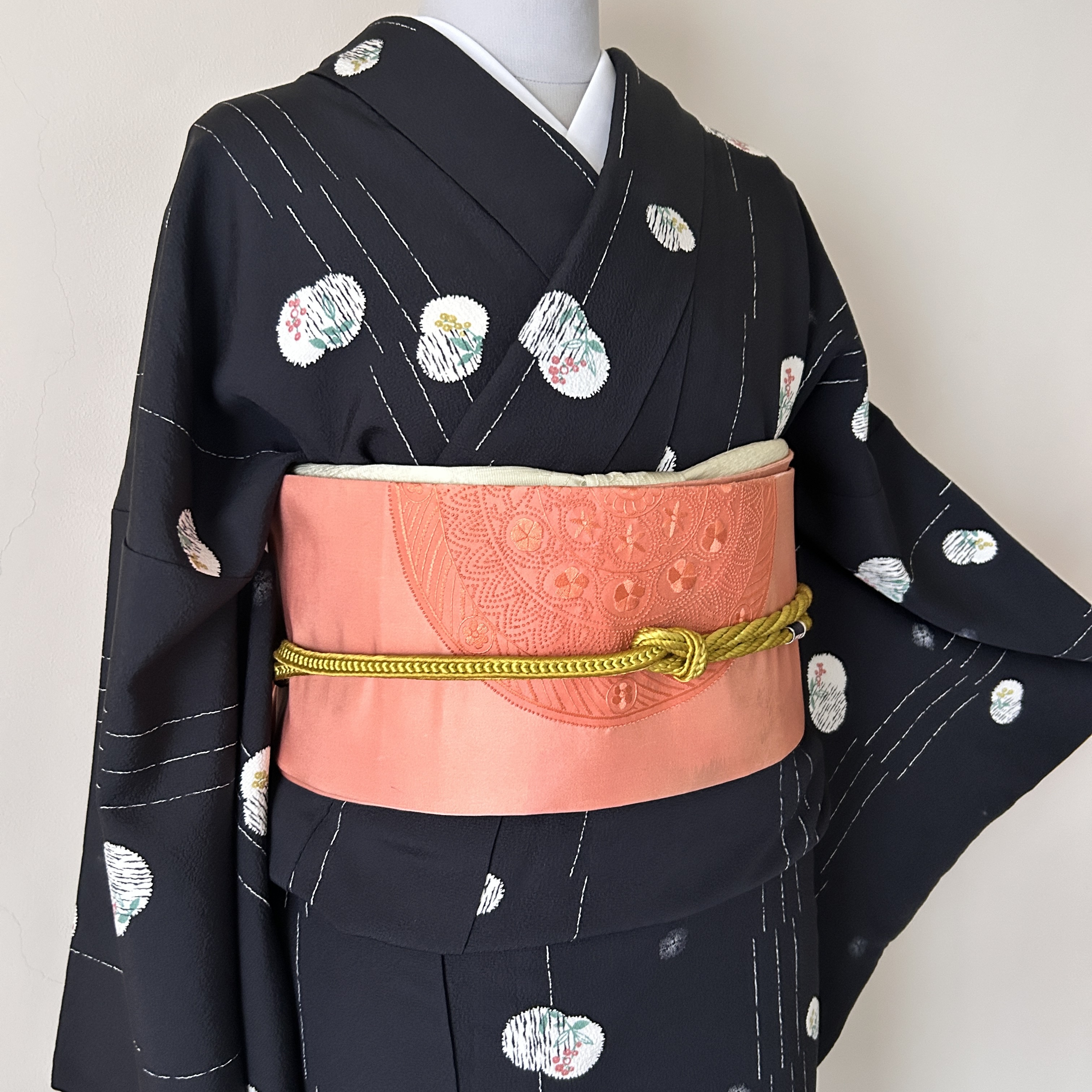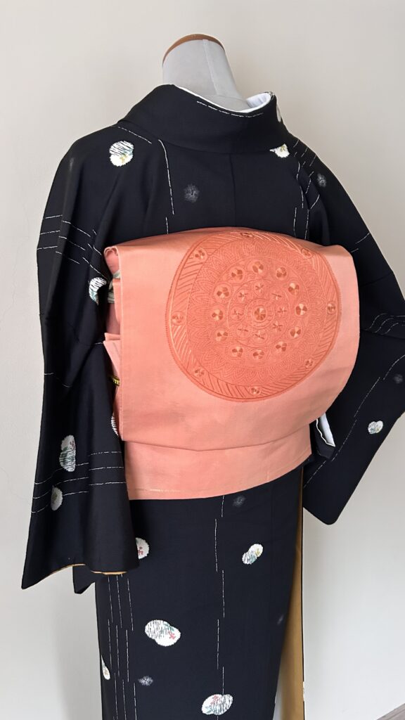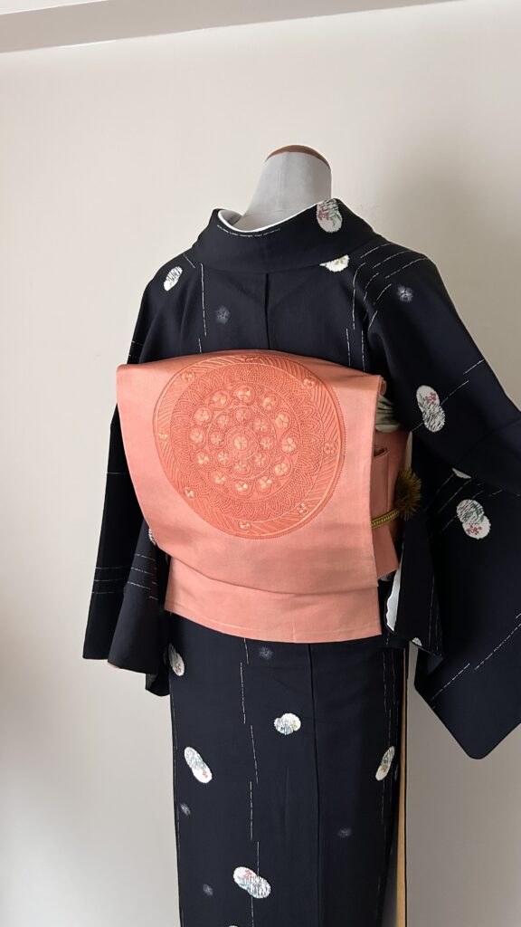 お太鼓と前帯に相楽刺繍の丸紋柄が入っていて、どんな着物にも合わせやすそうな帯です。