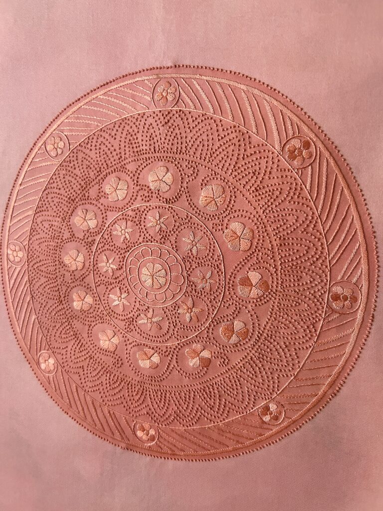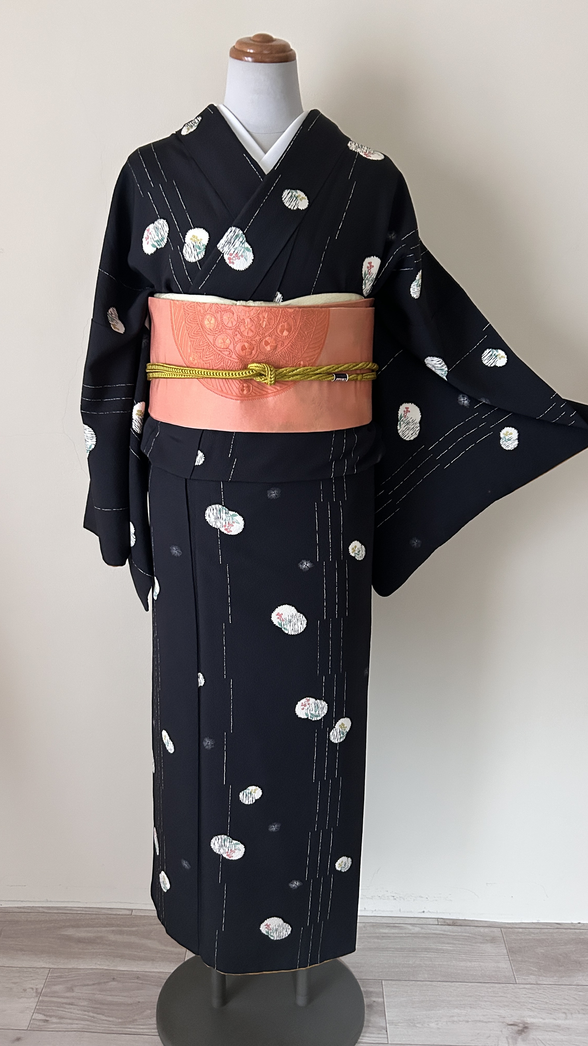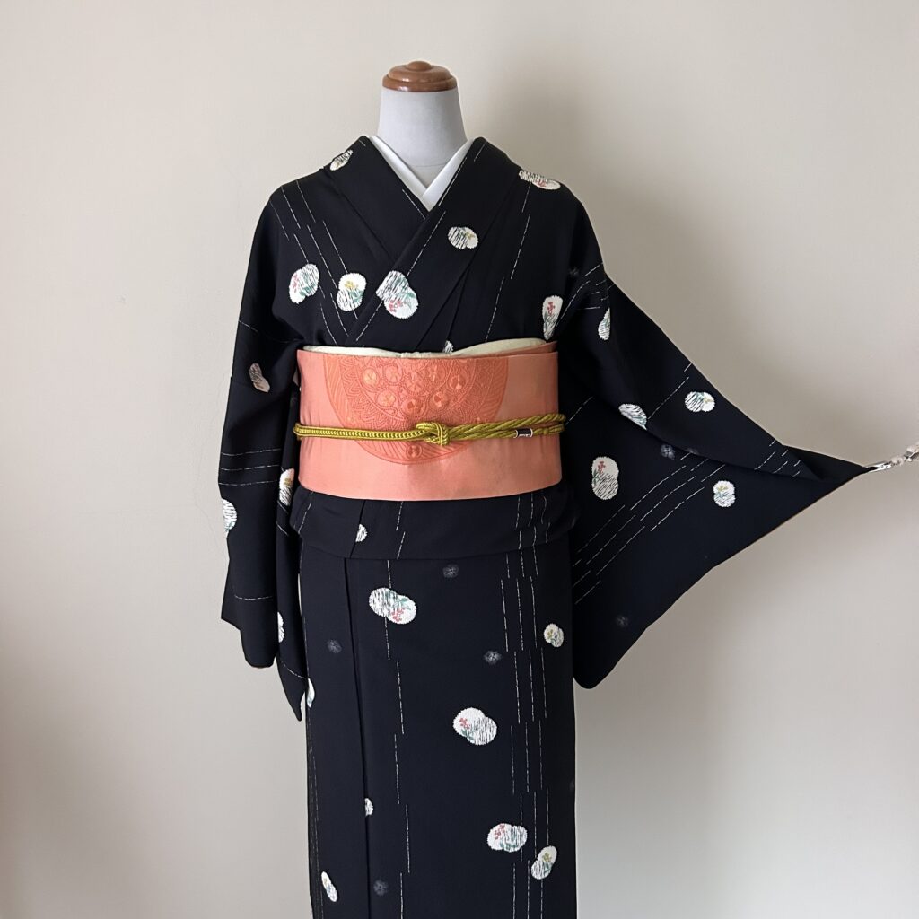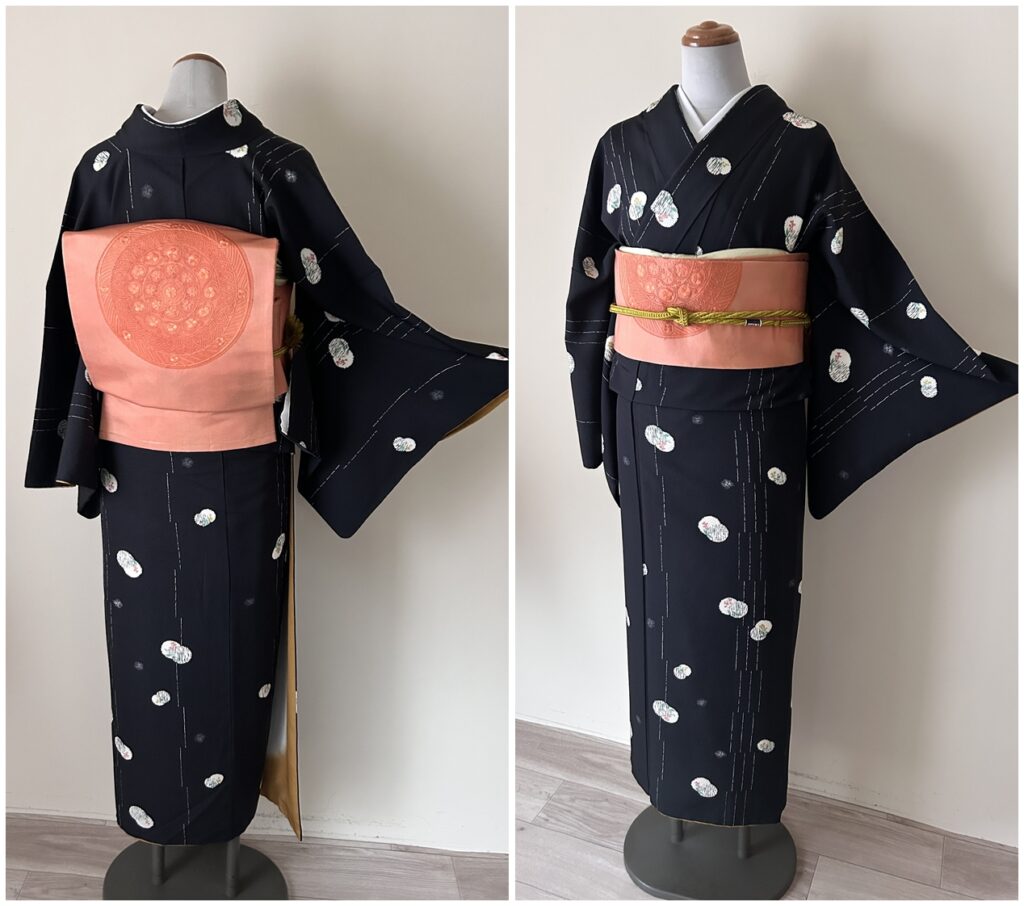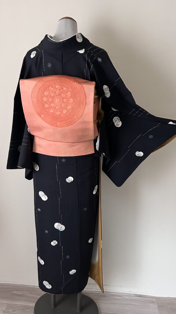 お太鼓と前帯に相楽刺繍の丸紋柄が入っていて、どんな着物にも合わせやすそうな帯です。