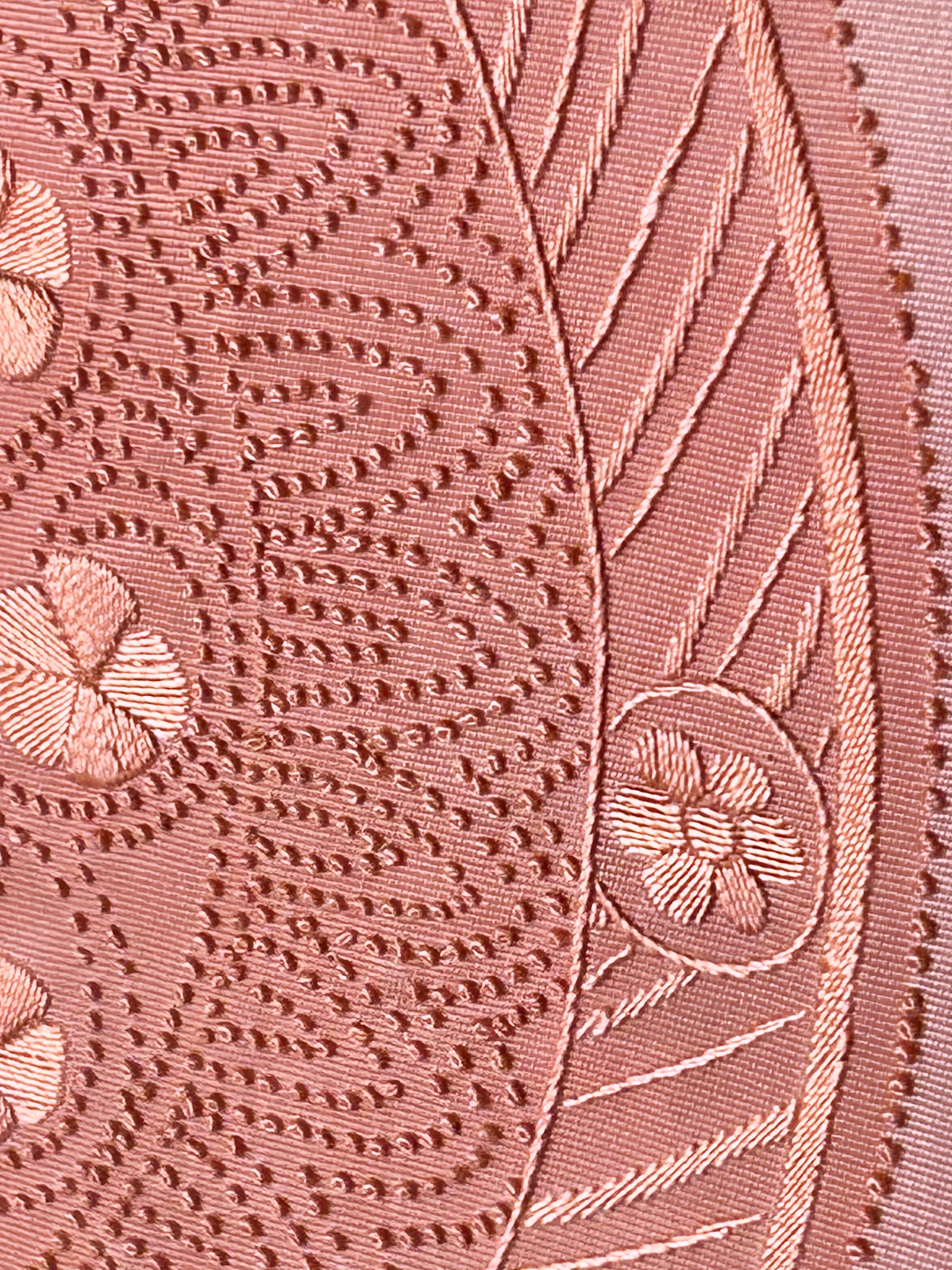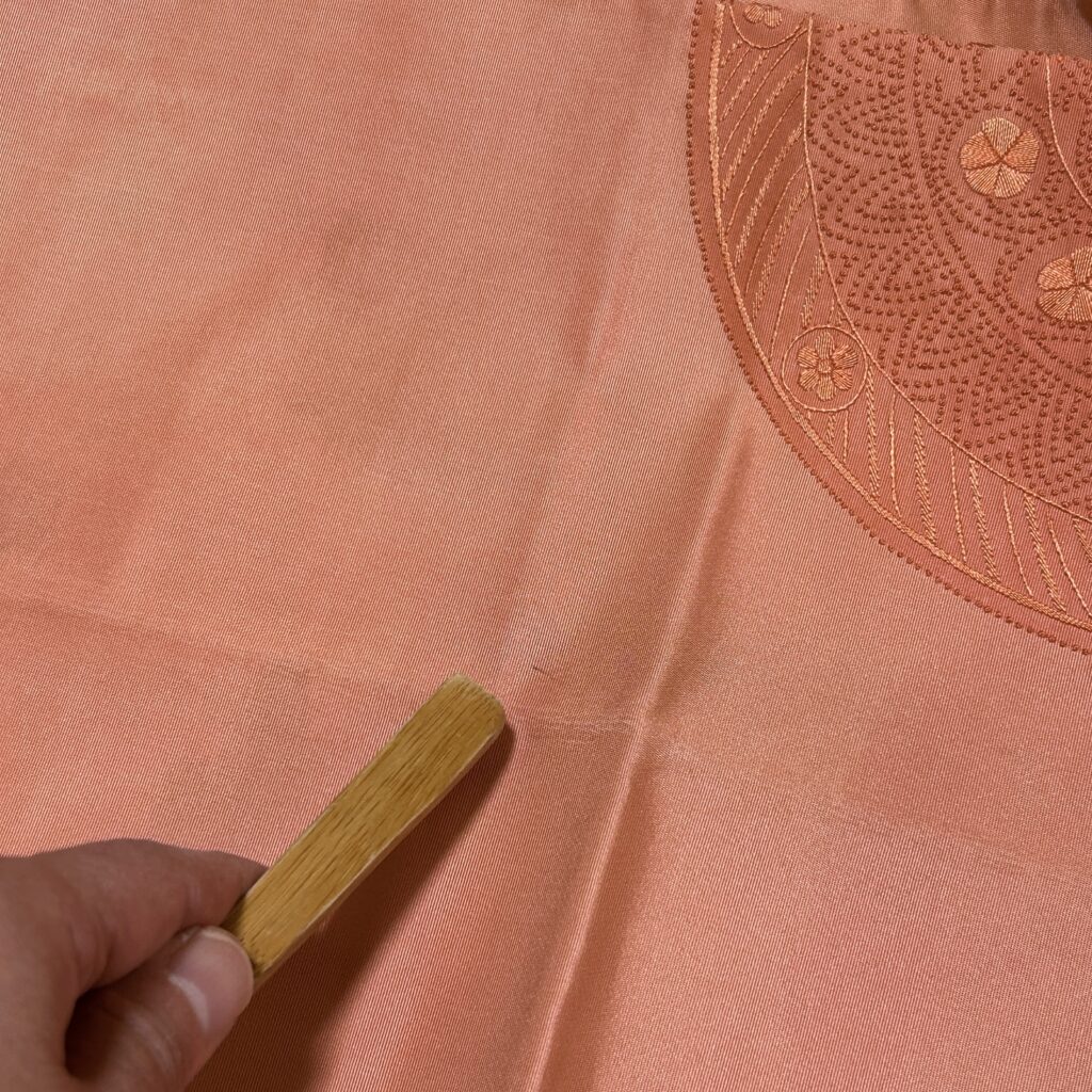 【袋帯】正絹袋帯・コーラルピンク・相楽刺繍・お太鼓柄・マーブル調ぼかしカラー・少し難有