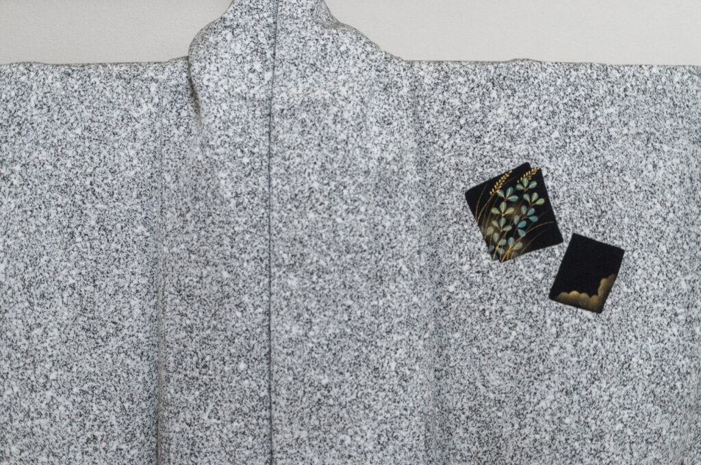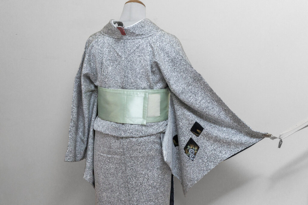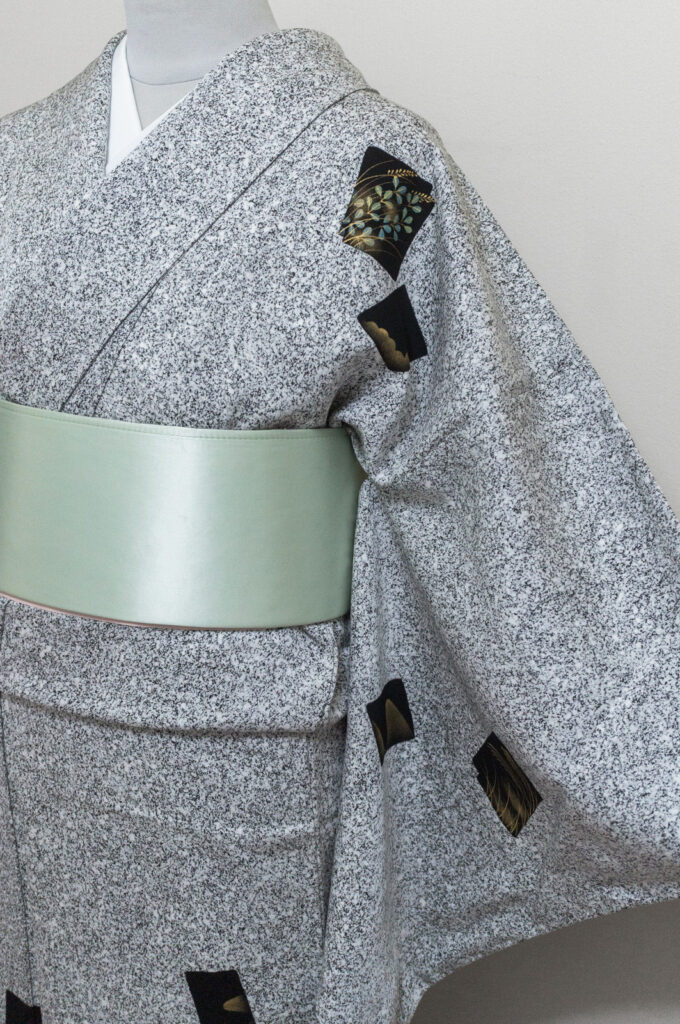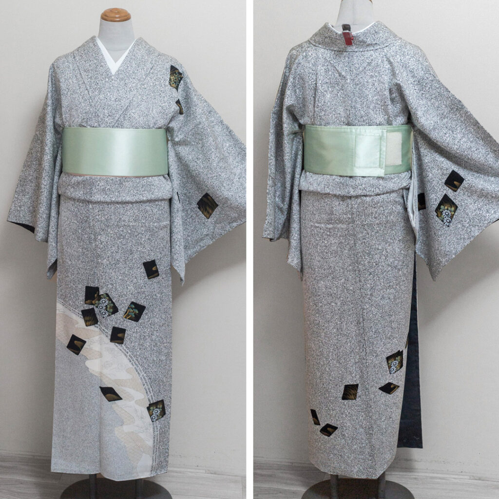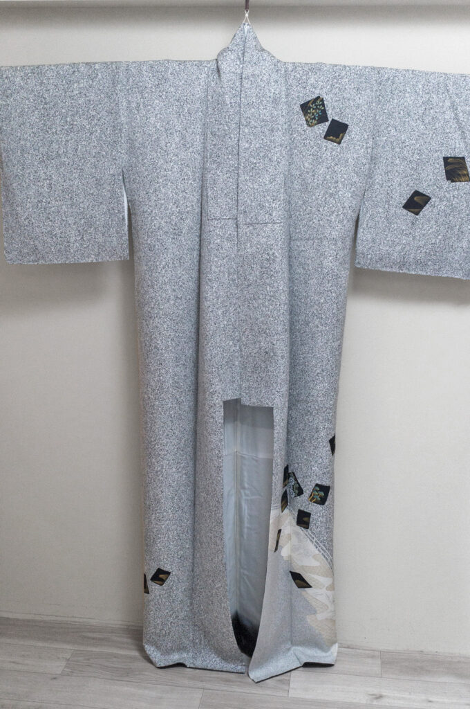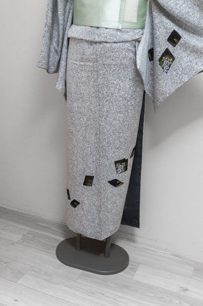 叩き染め地に金彩と手描き友禅をあしらった付下げで、全体的には落ち着いたグレー地見えます。