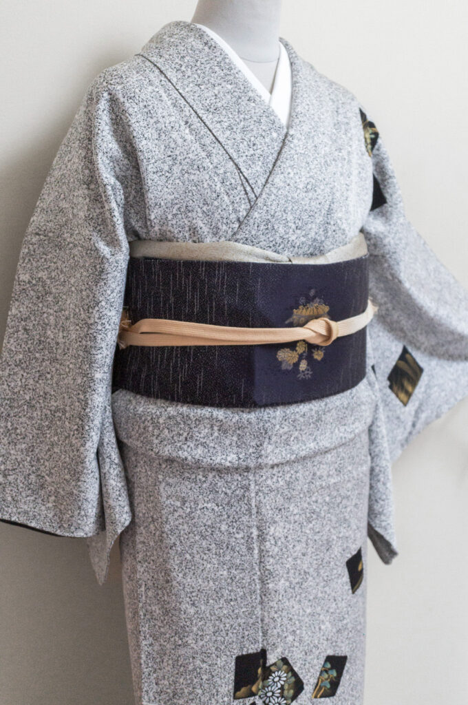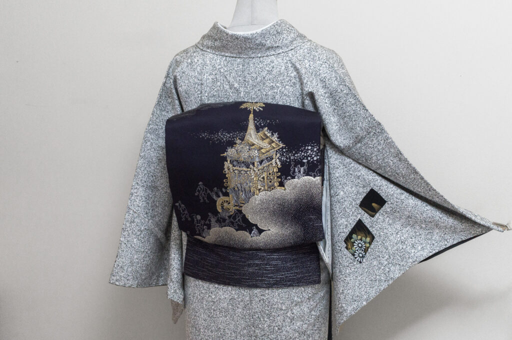 ※銀通しに金糸使いの名古屋帯を締めてみました。 ちょっとオシャレをしての「よそ行き着」としてもお使いいただけるデザインと思います。