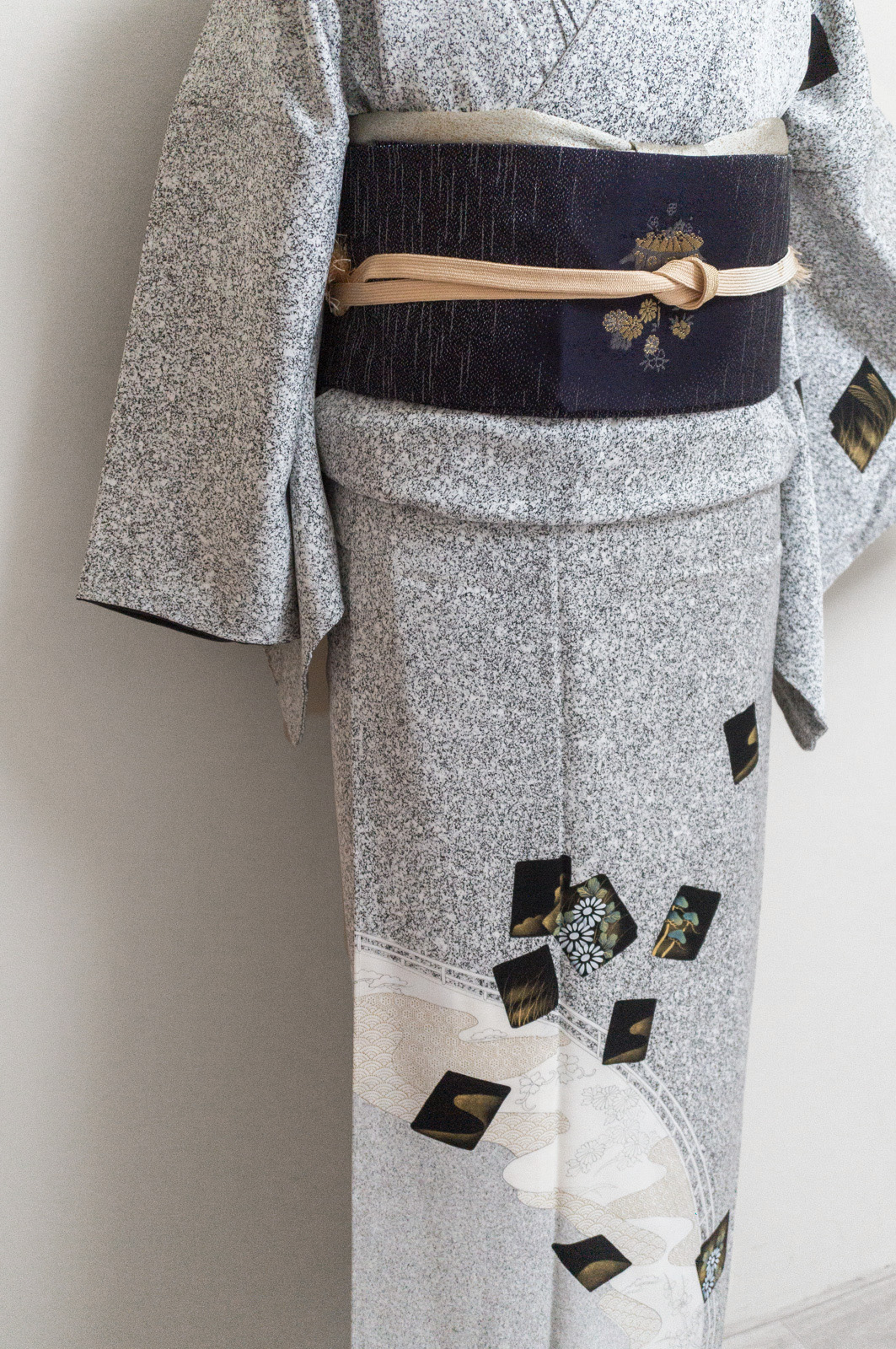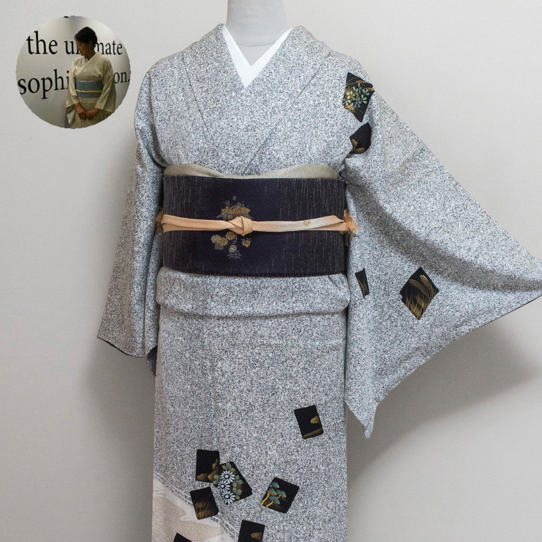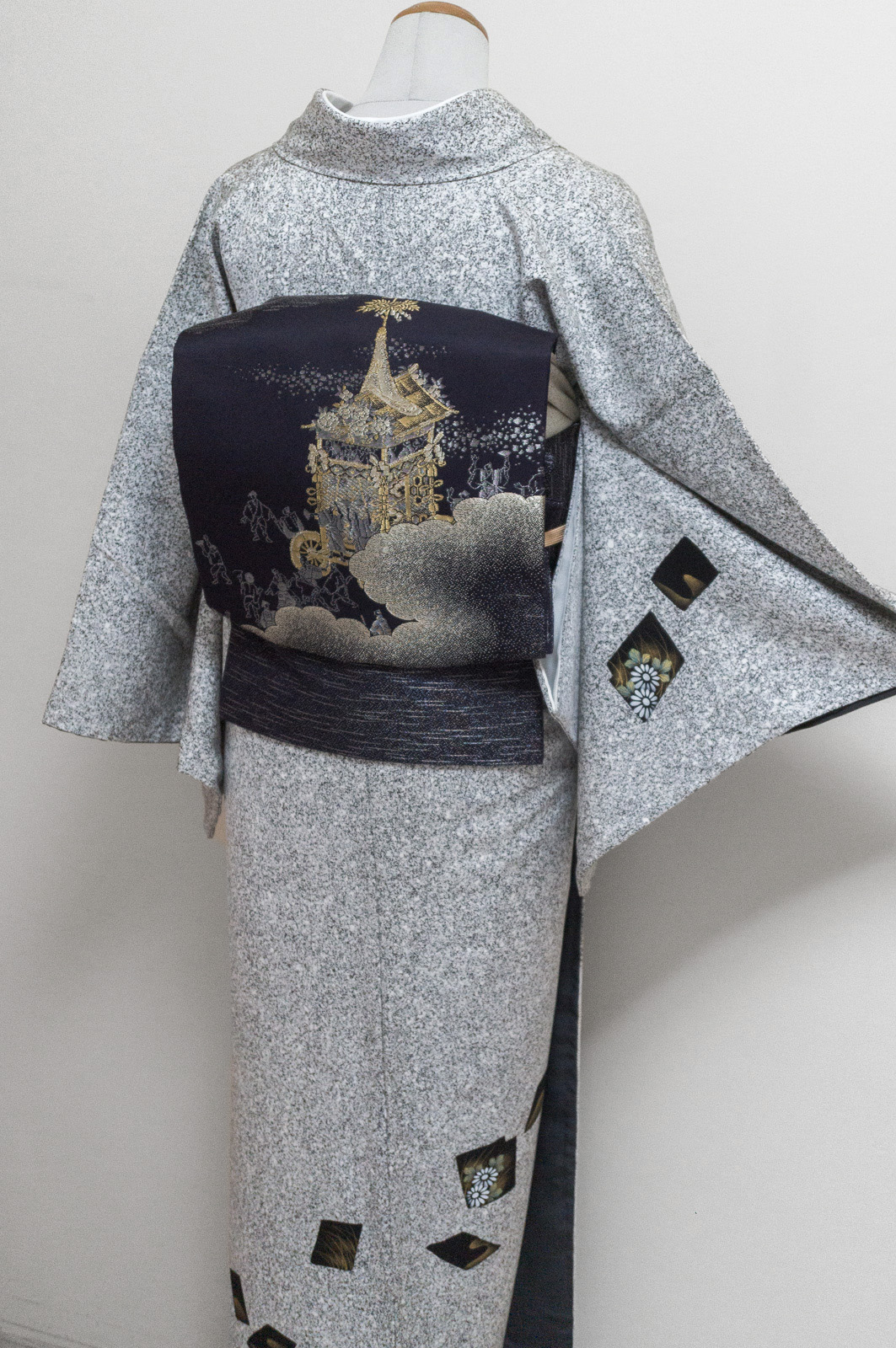 ※銀通しに金糸使いの名古屋帯を締めてみました。 ちょっとオシャレをしての「よそ行き着」としてもお使いいただけるデザインと思います。
