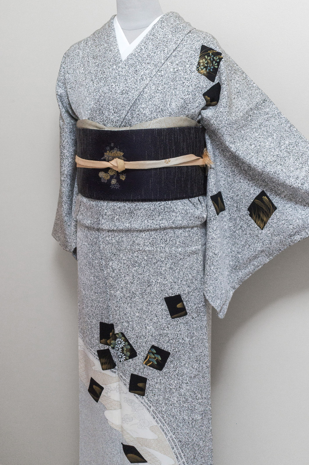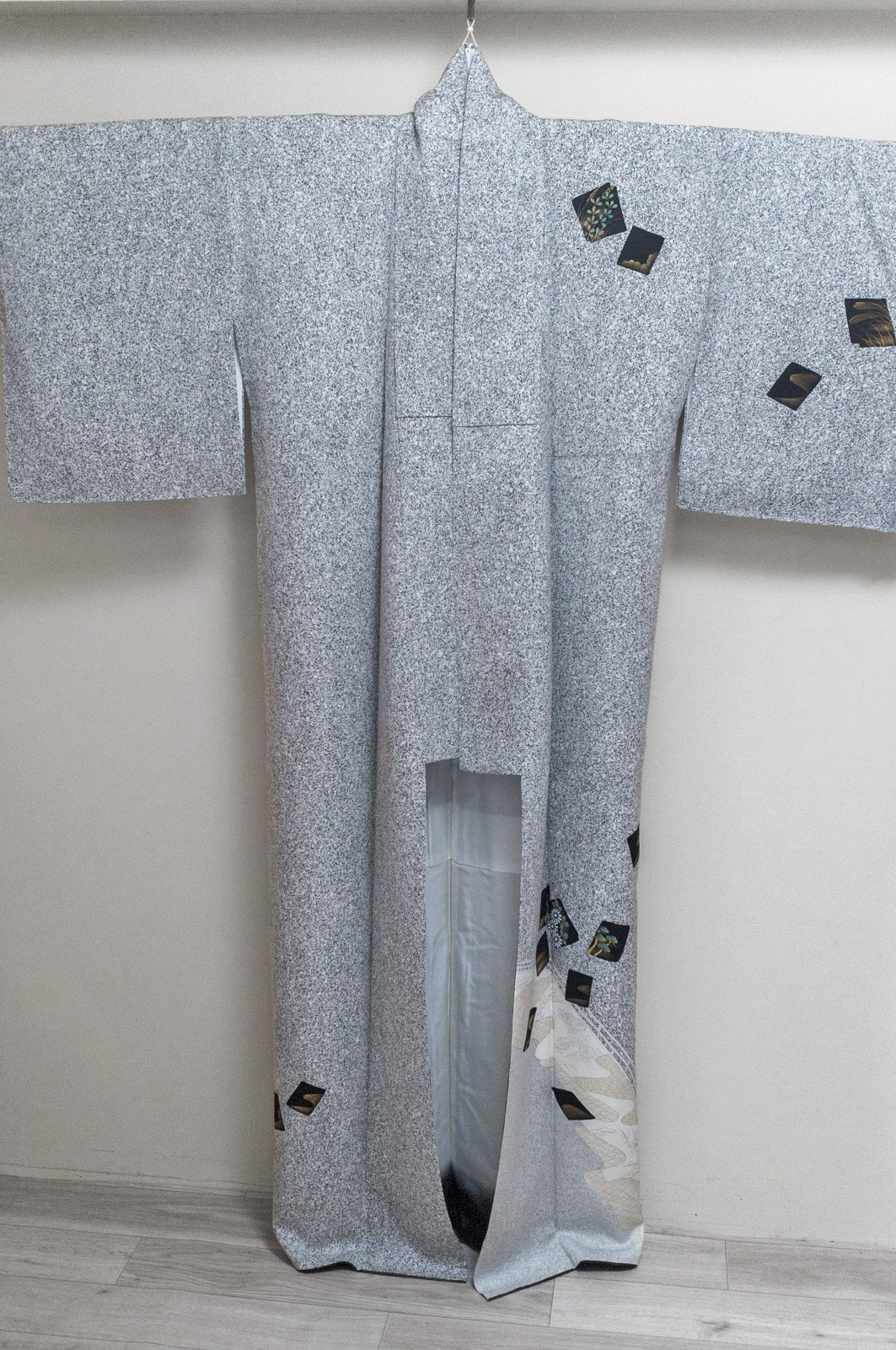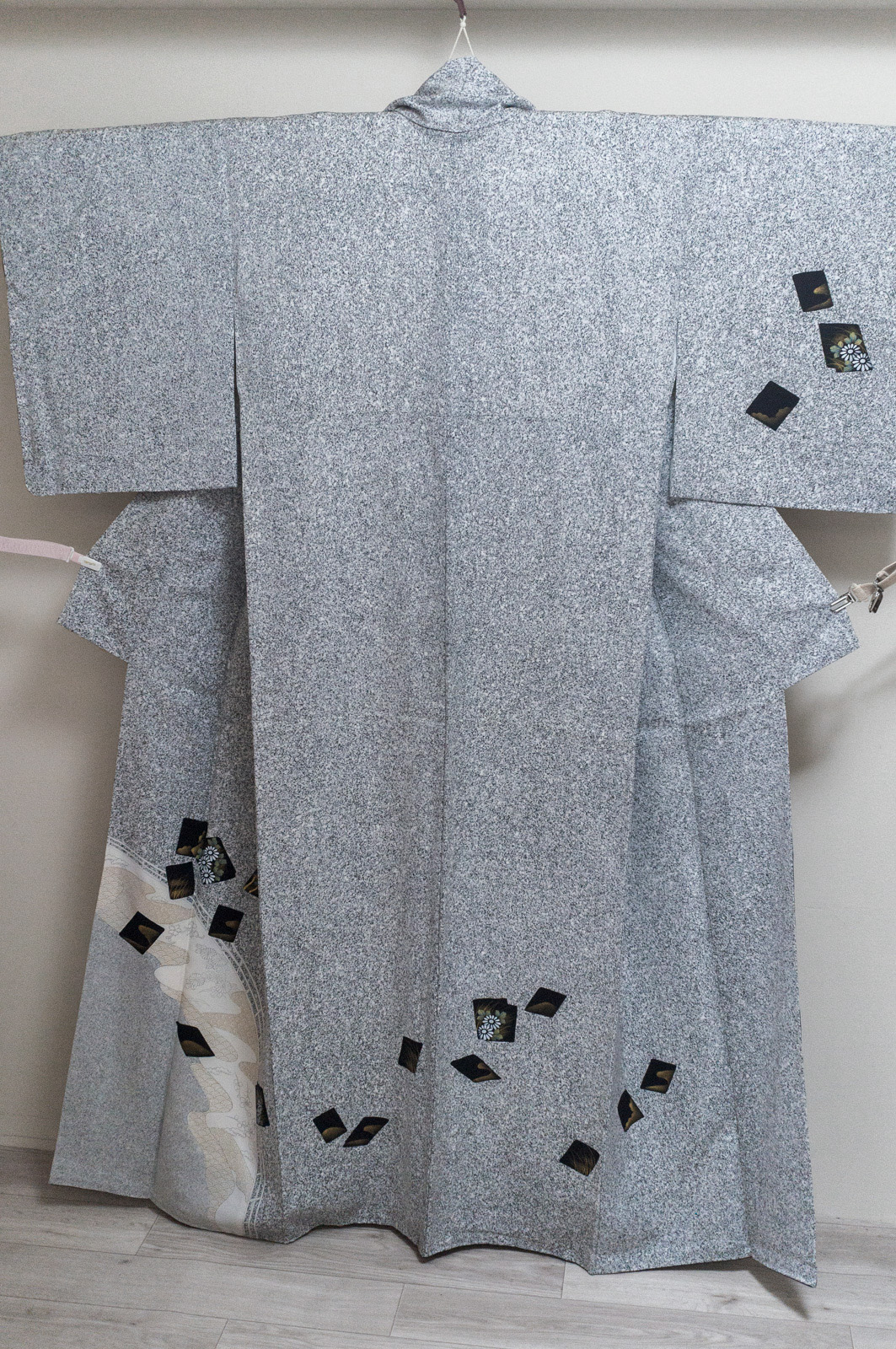 叩き染め地に金彩と手描き友禅をあしらった付下げで、全体的には落ち着いたグレー地見えます。
