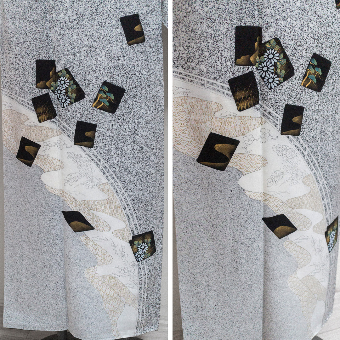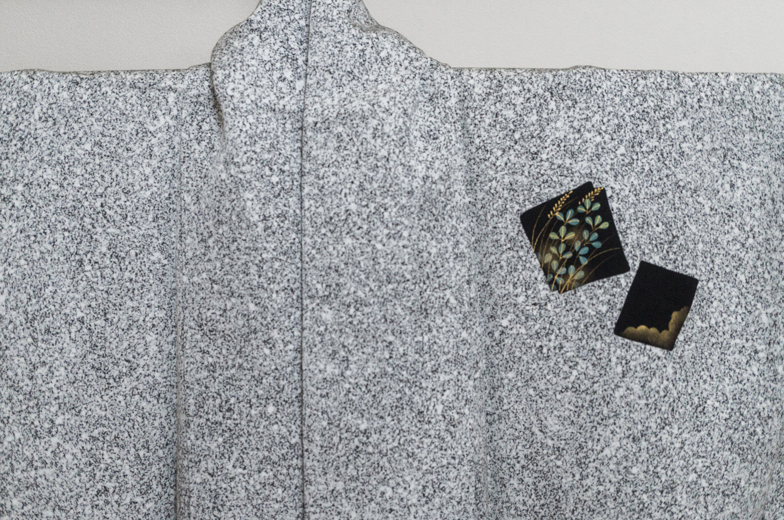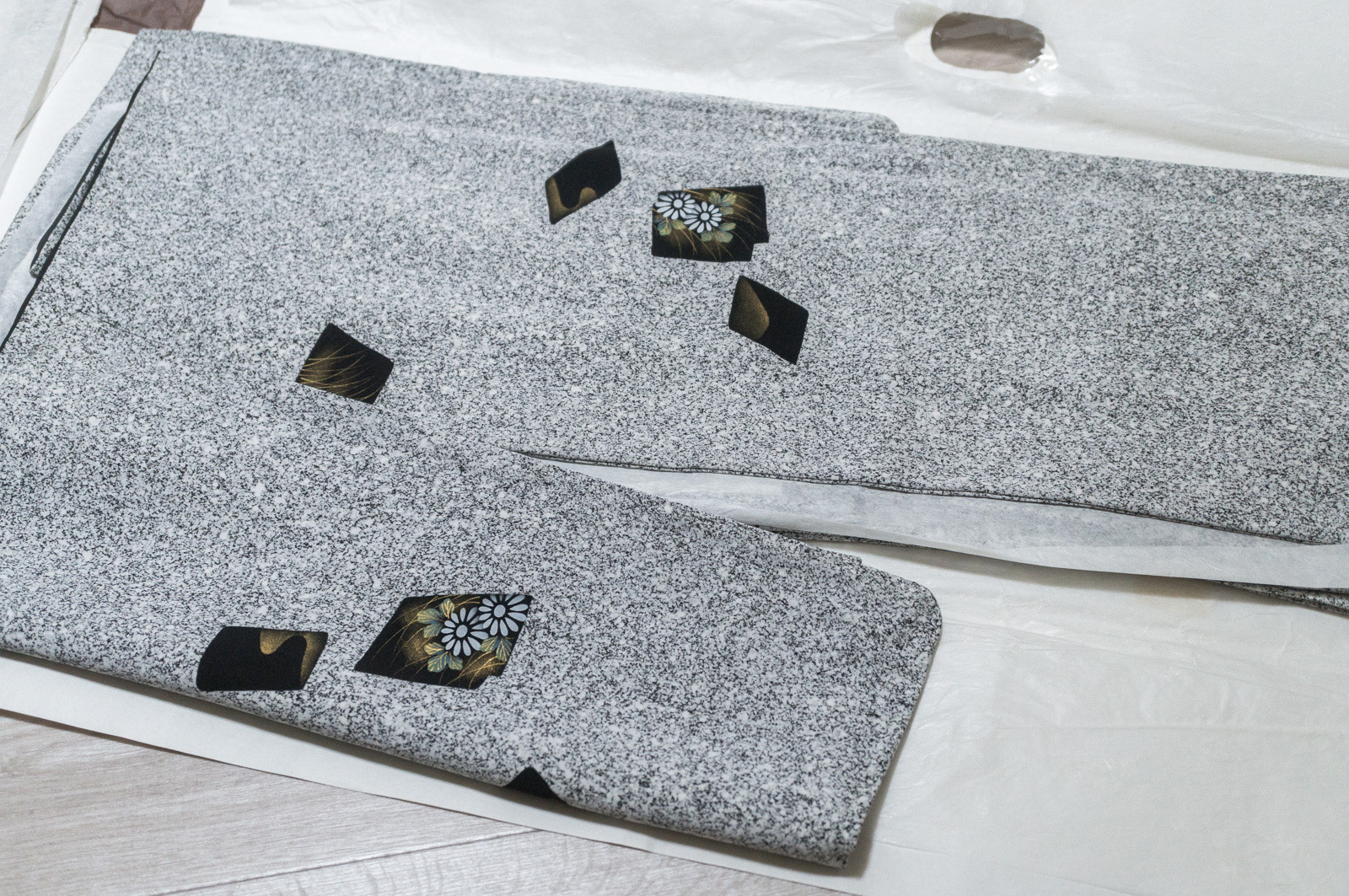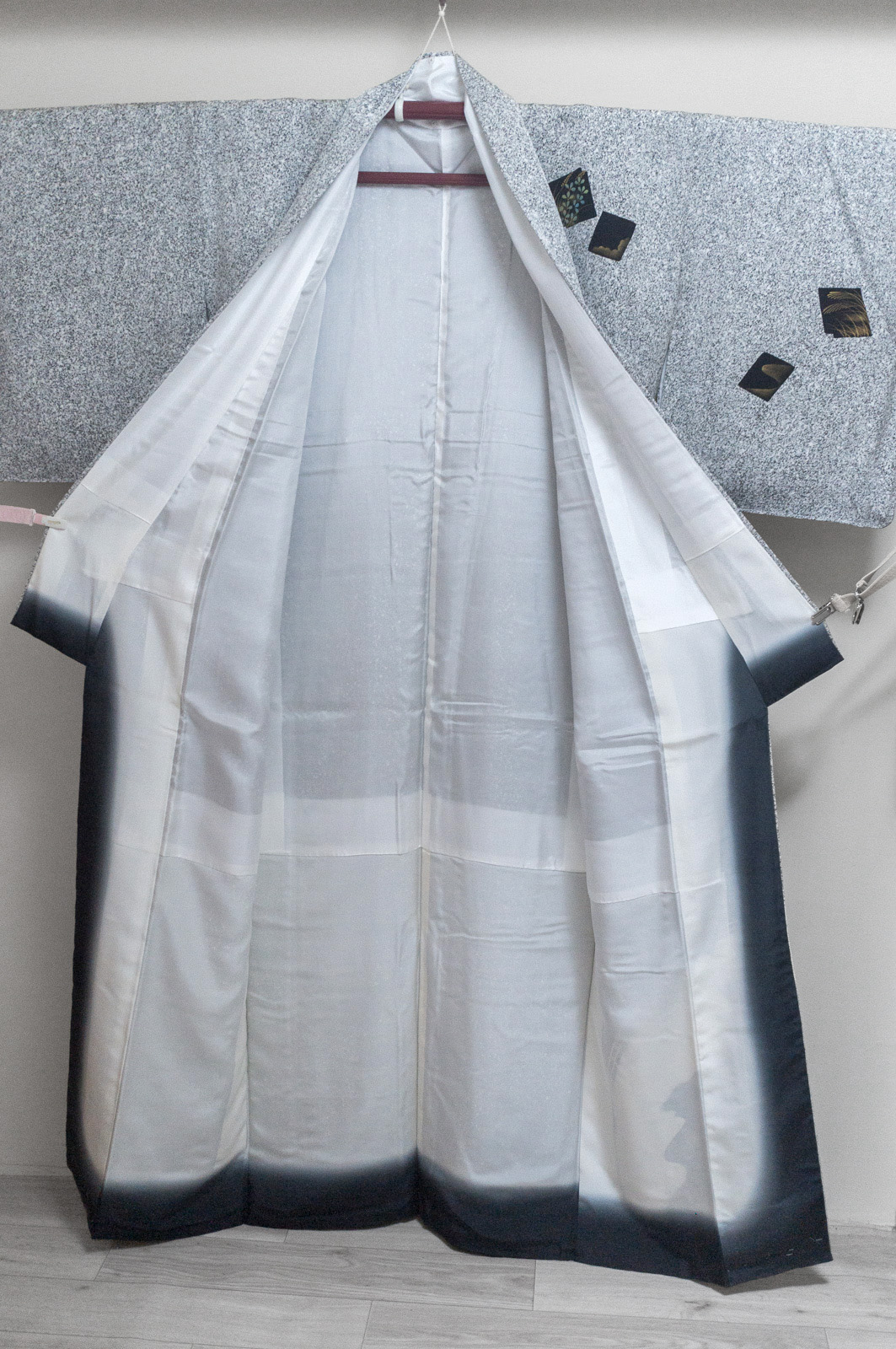叩き染め地に金彩と手描き友禅をあしらった付下げで、全体的には落ち着いたグレー地見えます。
