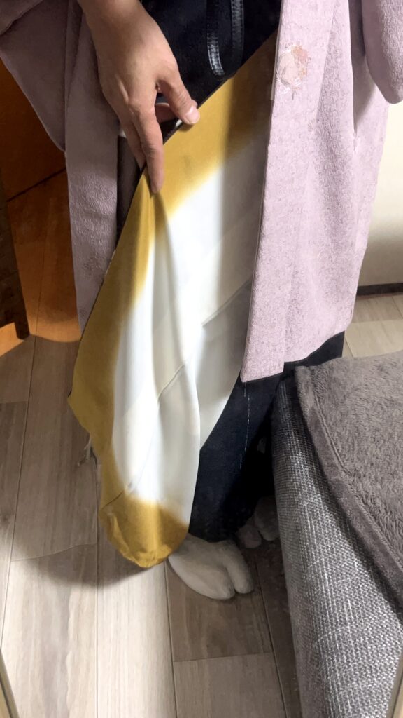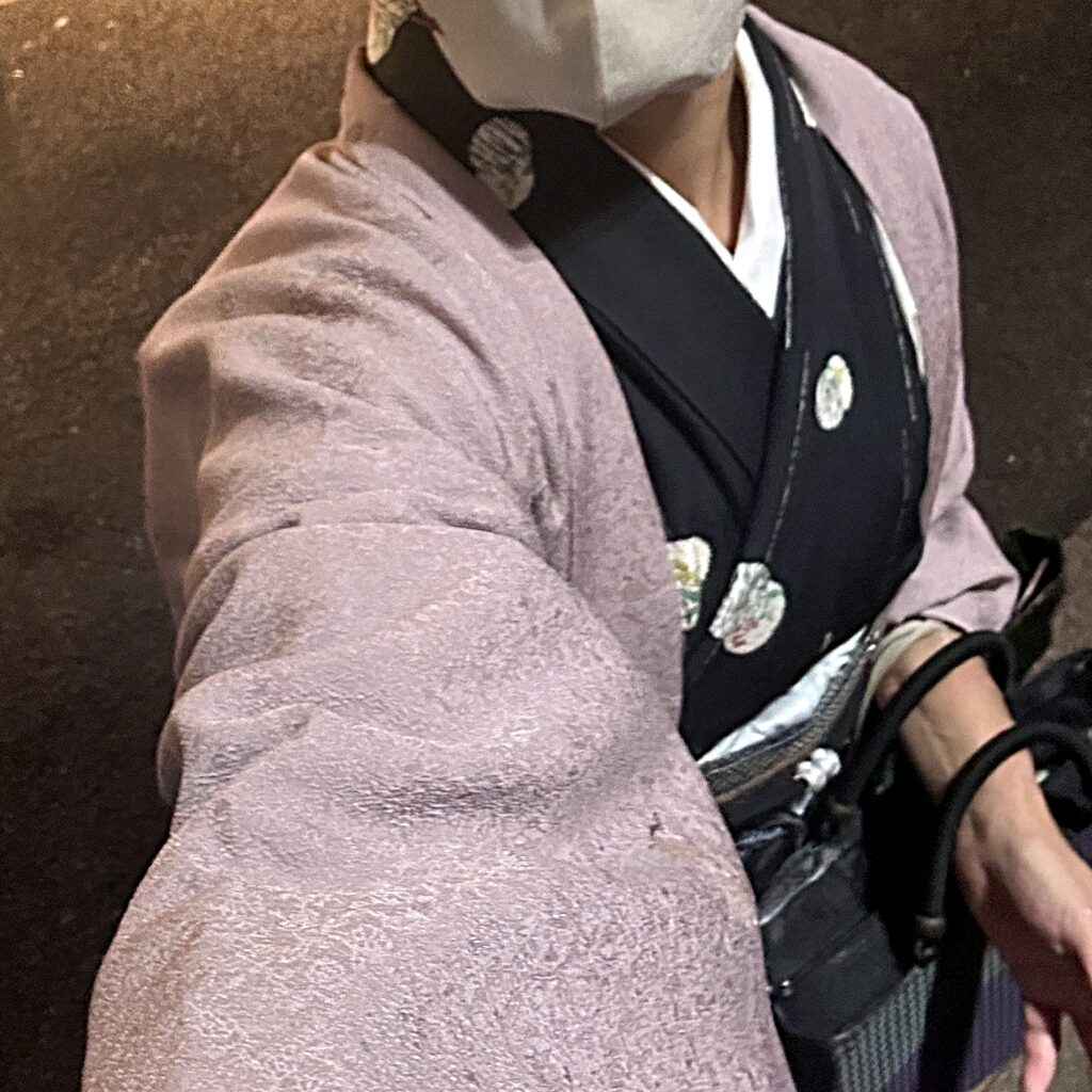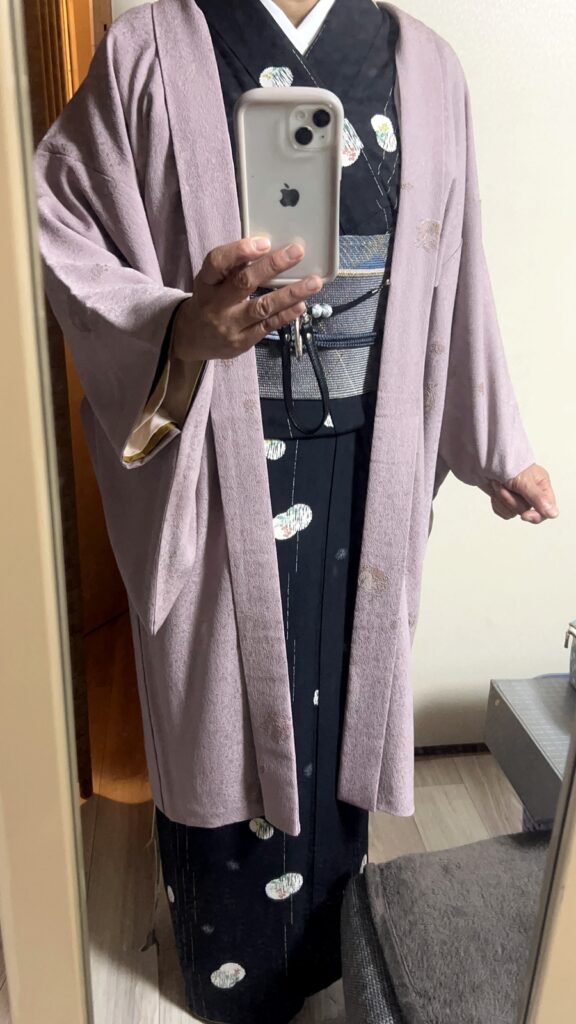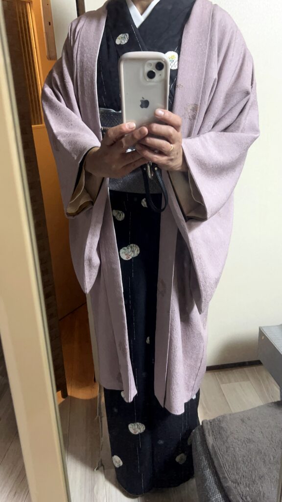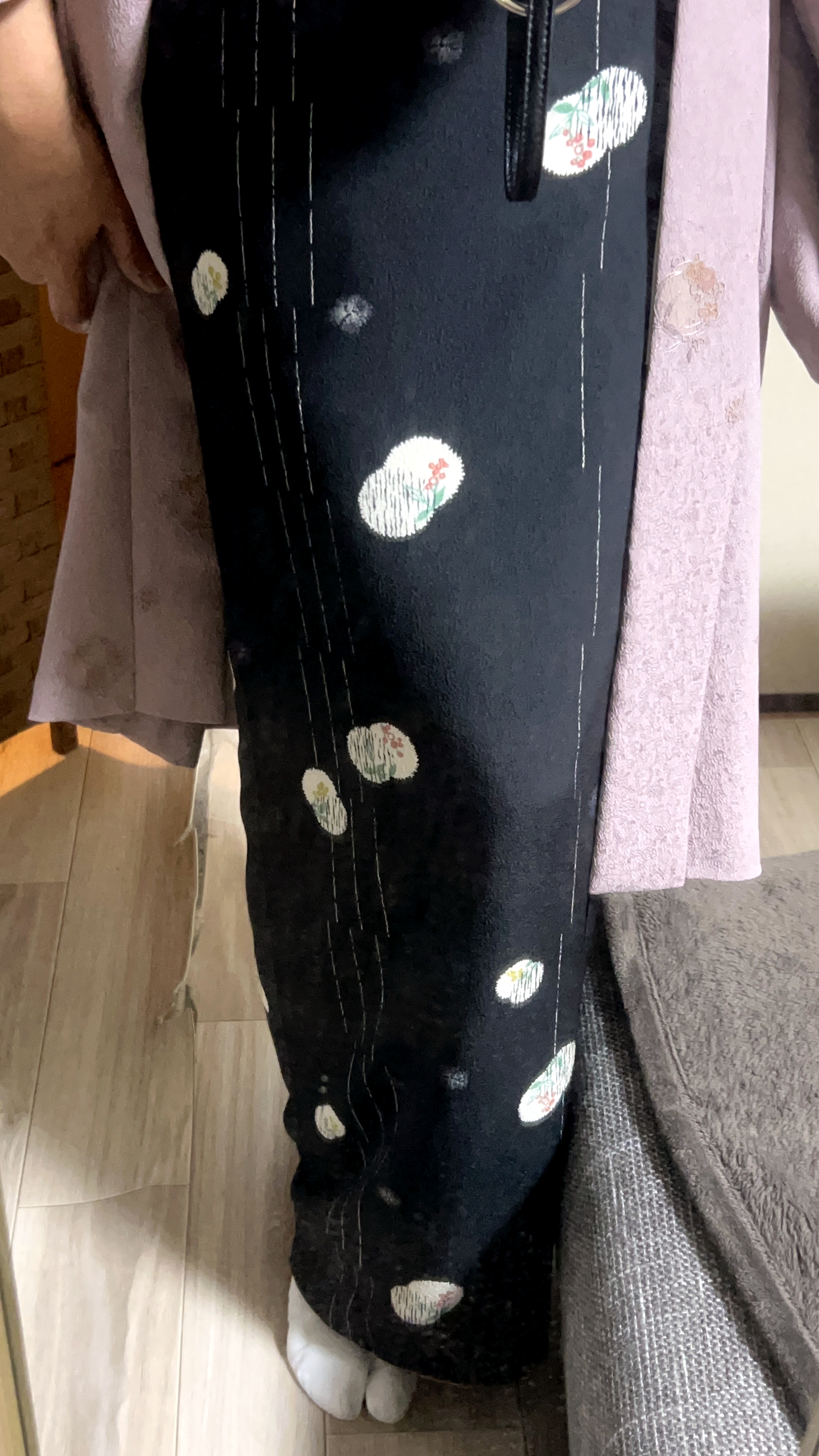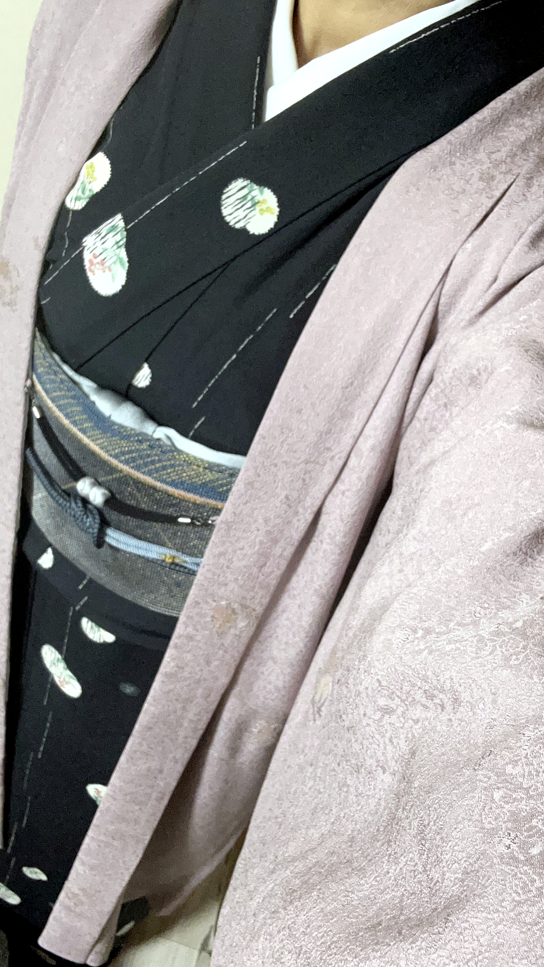 この日は、リユースショップで買った「黒地に飛び柄」の小紋を着ました。