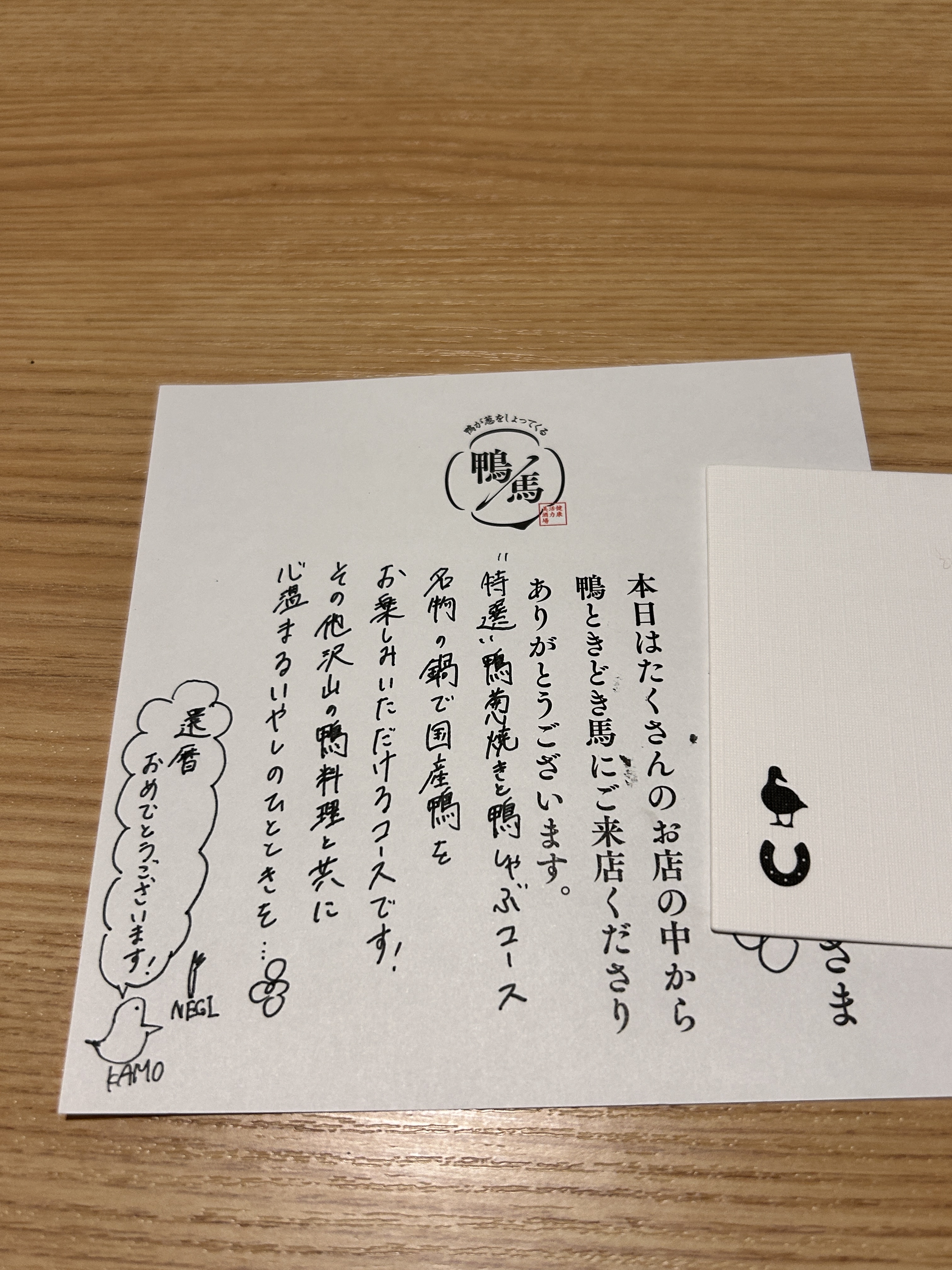 息子夫婦が「還暦祝い」にと「鴨ときどき馬 神保町本店」さんで食事をごちそうしてくれました。